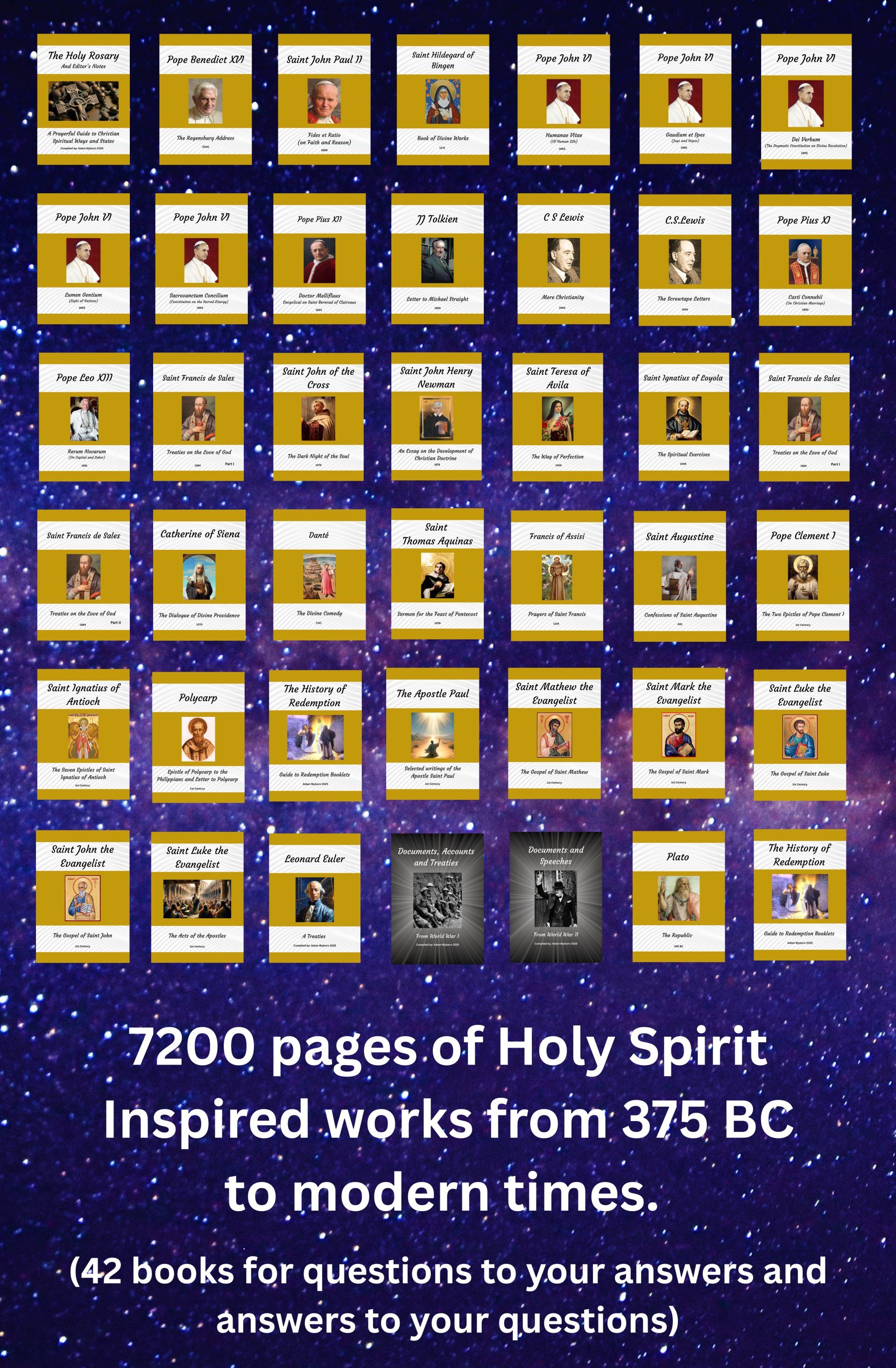 A comprehensive library of 42 Books, inspired by the Truth and Love of the Holy Spirit, from Plato (375 BC) to modern times. This library gives undeniable understanding of history and the truths of the human condition, focusing on the everlasting phenomenon of the redemption of humankind which was, and continues to be, secured by the sacrifice of Jesus and his resurrection.